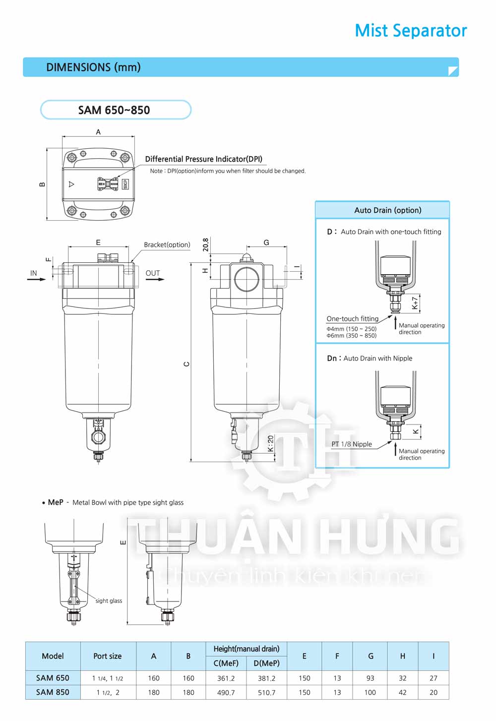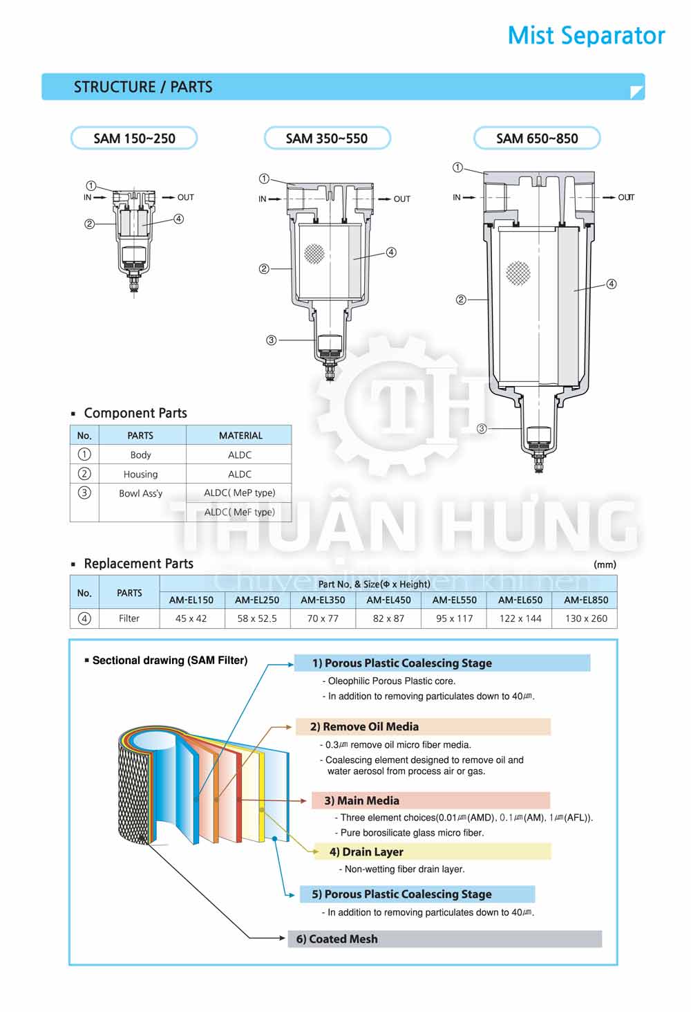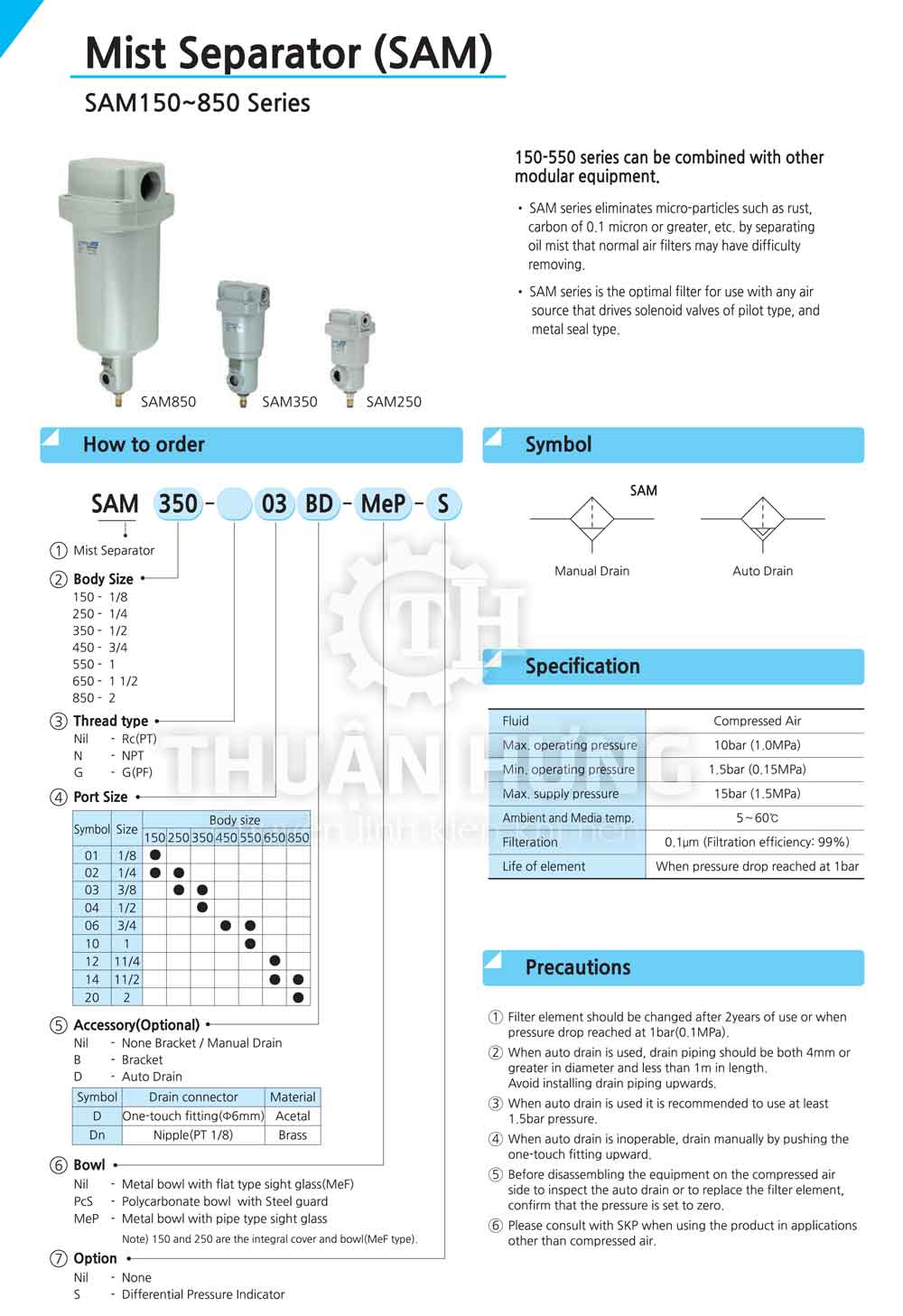 Thông số kỹ thuật của bộ lọc tinh khí nén SKP SAM650-14BD (Phi 49, Lọc Bụi 0.1 Micrômét)
