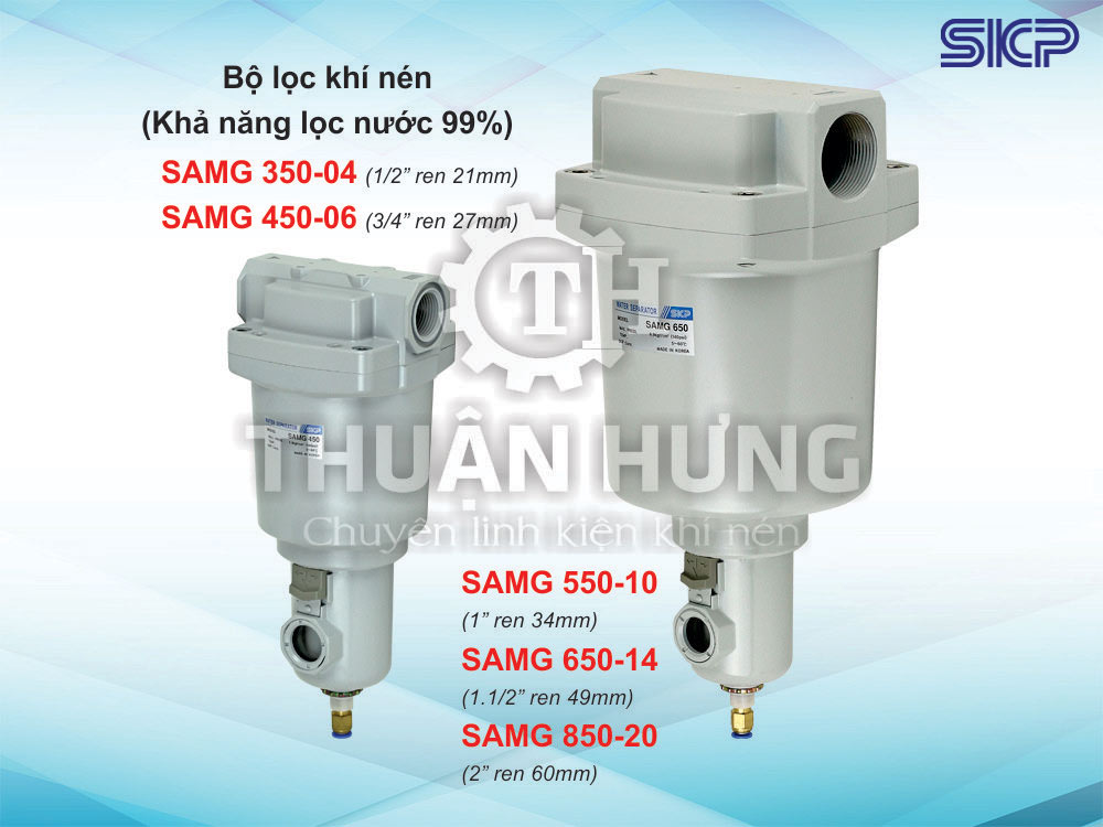 Bộ lọc khí nén SKP SAMG650-14BD là thiết bị tách nước từ khí nén có chức năng lọc sạch không khí giúp lọc sạch hơi nước và bụi trong hệ thống máy nén khí..