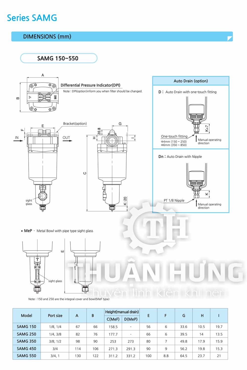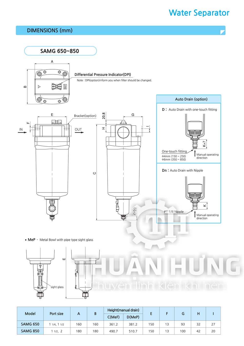 Thông số kỹ thuật của bộ tách nước khí nén SKP SAMG450-06BD Phi 27 (Lọc Nước 99%)